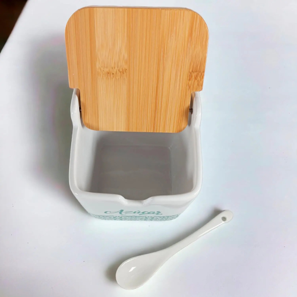 Embellece tu mesa con nuestro azucarero de porcelana blanca, resaltando su atractiva tapa de bambú y sutil estampado en verde suave.
