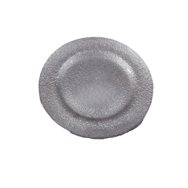Bajo plato o plato de presentación de cristal con micropuntos, color plateado.