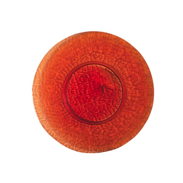 Fabricado en cristal transparente color naranja estriado, este bajo plato es ideal para dar un toque moderno, fresco y sofisticado a cualquier ocasión.