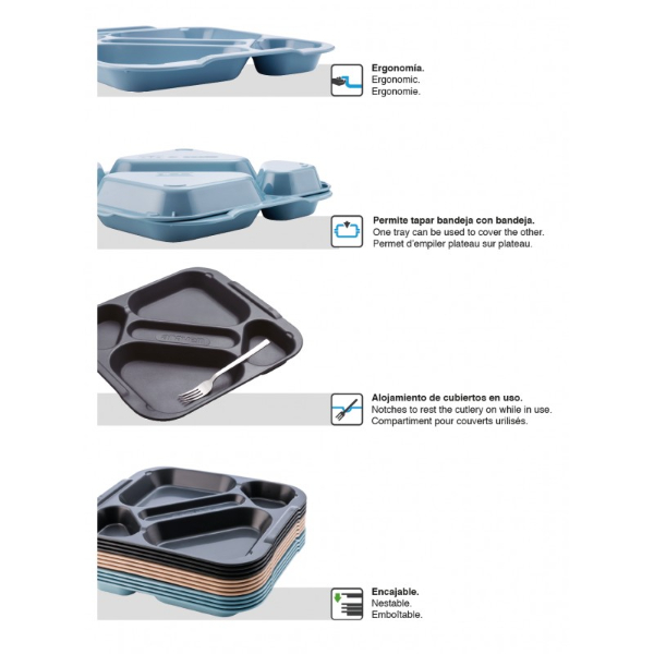 Están dotadas de 5 compartimentos: dos grandes para platos principales, dos pequeños para postres, fruta, pan, vaso y un hueco central rectangular para posicionar los cubiertos.