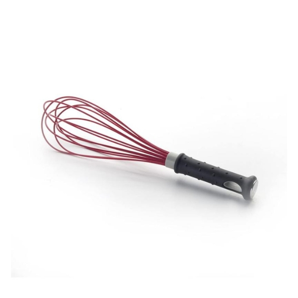 Indeformable, varilla de acero 18/10 recubierta en color rojo. Mango de fibra de vidrio resistente hasta 250ºC. Sirve para batir crema de leche, huevos, claras a punto de nieve, masas ligeras y cremas entre otras.