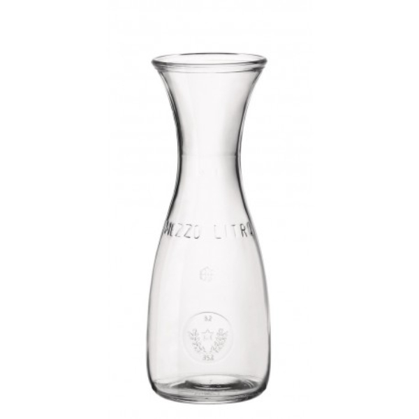 Botella Misura 1L. Botella fabricada en vidrio no templado de corte caliente, transparente con boca ancha y decorados en relieve. Dimensiones: 26,20 cm de alto y 1L de capacidad.