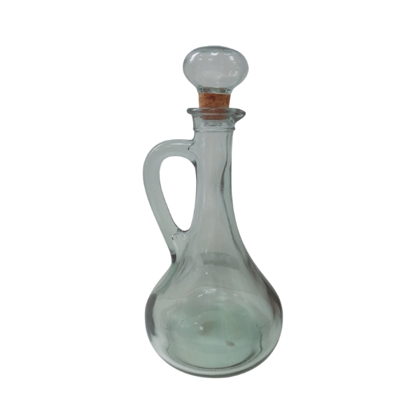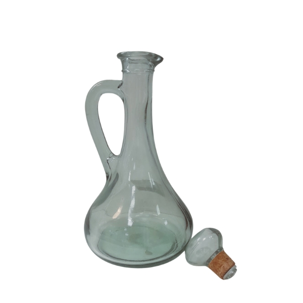 Botella de cristal reciclado transparente modelo galaxy con vertedor, agarre de asa, tapón de bola cristal y corcho, indicada especialmente para el uso de licores.