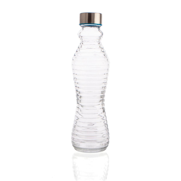Bonita botella de cristal tapón de rosca en acero inoxidable que evita que las bebidas en su interior cojan sabores no deseados de otros alimentos de la nevera. Está decorada con relieve que aparte de decorativa le ofrece un mayor agarre para evitar resbalones.