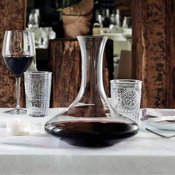 Este decantador, de forma clásica y líneas sinuosas, es una herramienta indispensable que permite que el vino se oxigene adecuadamente y exprese todas sus cualidades.