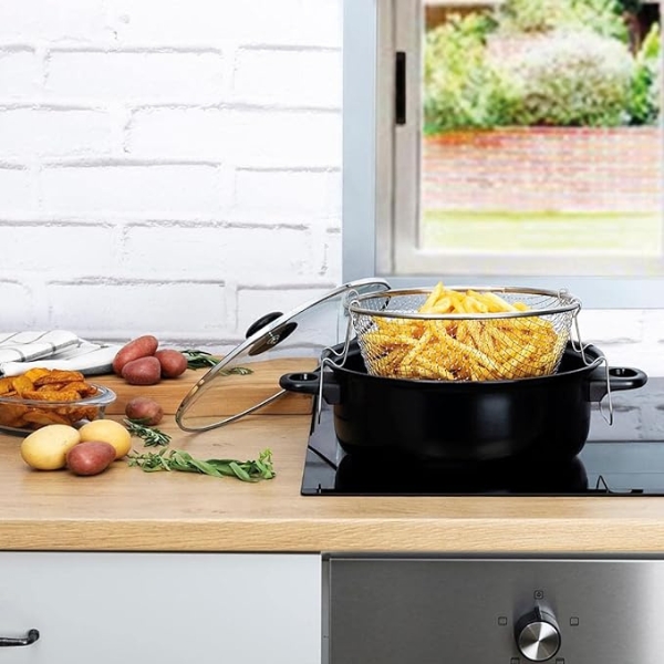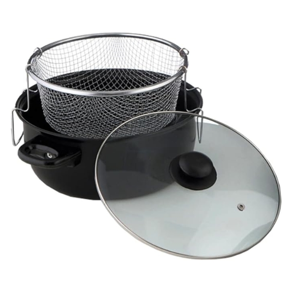 Esta fabricada en acero carbonatado con asas de baquelita y su cestillo es de acero inoxidable con soportes para escurrir perfectamente los fritos, dispone de una tapa de vidrio templado con válvula a traves de la que podrá ver el proceso de fritura.