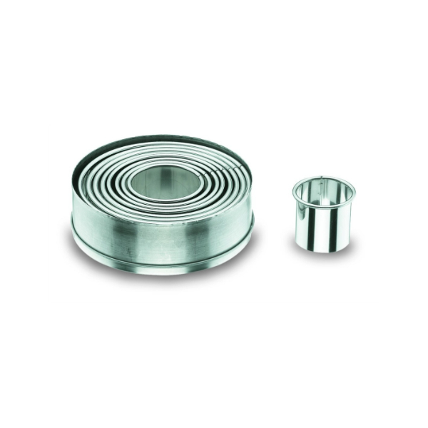 Caja de 9 cortapastas redondos de Lacor fabricados en acero inoxidable 18/10, para preparación de masas y repostería.