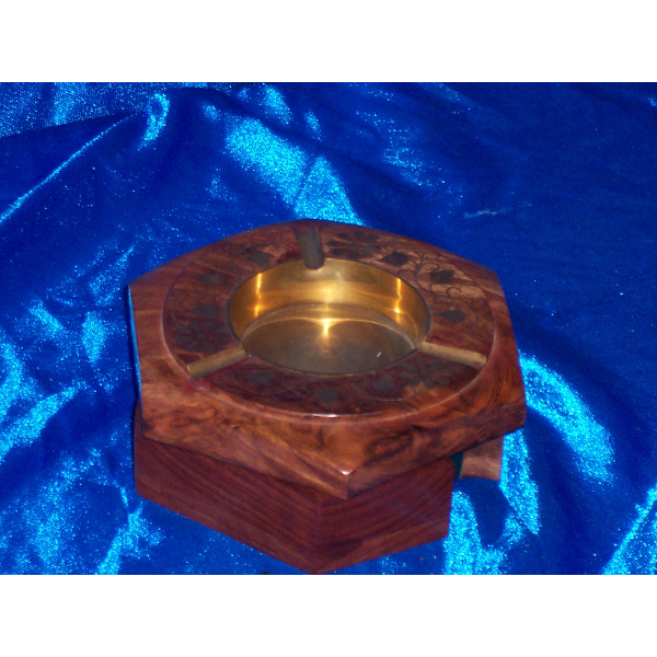 Elegancia y funcionalidad se combinan en este exclusivo cenicero artesanal, elaborado con una base de madera natural y un interior de metal dorado resistente al calor.