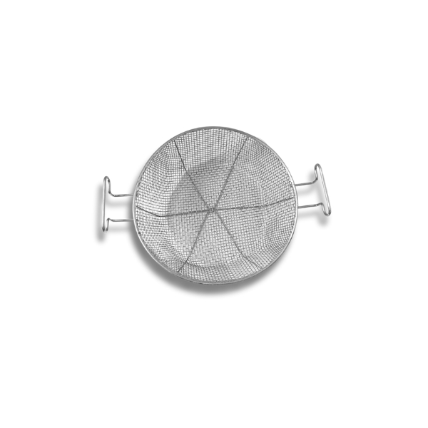 Cesta para freidora industrial de acero inoxidable 18/8 con solapa resistente para una fritura perfecta, malla reforzada y asas abatibles.