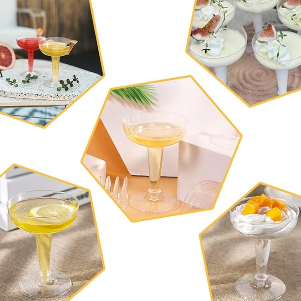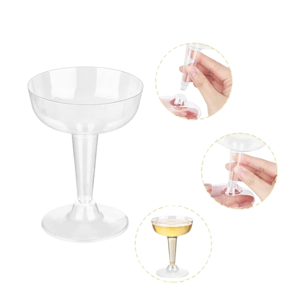 Pack de 6 copas cava champan baja con pie transparente y desmontable ideales para un brindis en eventos especiales, nochevieja, navidades, cumpleaños, bodas, comuniones, aniversarios, bautizos o caterings.