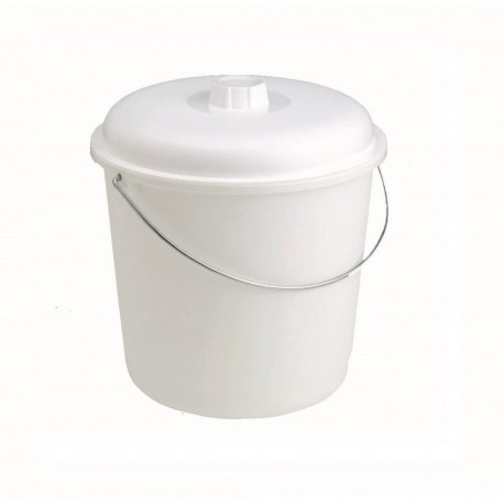 Cubo basura de polietileno con tapa y asa de acero inoxidable, ideal para manipular o mover ingredientes o productos químicos de limpieza en las zonas de preparación de alimentos, como mataderos, bodegas o cárnicas.