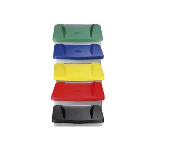 Disponible con tapa en diferentes colores para la gestión de residuos: blanca, verde, azul, amarillo, roja, negra o marrón sobre base gris o blanca.