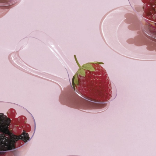 Cuchara degustacion arco transparente de poliestireno (PS), resistente y reutilizable, lo que la convierte en una elección ideal para profesionales de la hostelería y la restauración que buscan una forma elegante de presentar aperitivos y degustaciones.