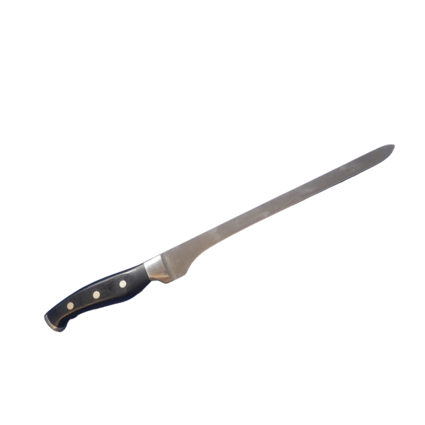 Cuchillo jamonero inox. forjado, con una longitud, estrechez y flexibilidad de su hoja que permite que pueda cortar muy finamente y con gran precisión, mientras el movimiento del corte se acopla al perfil del jamón.