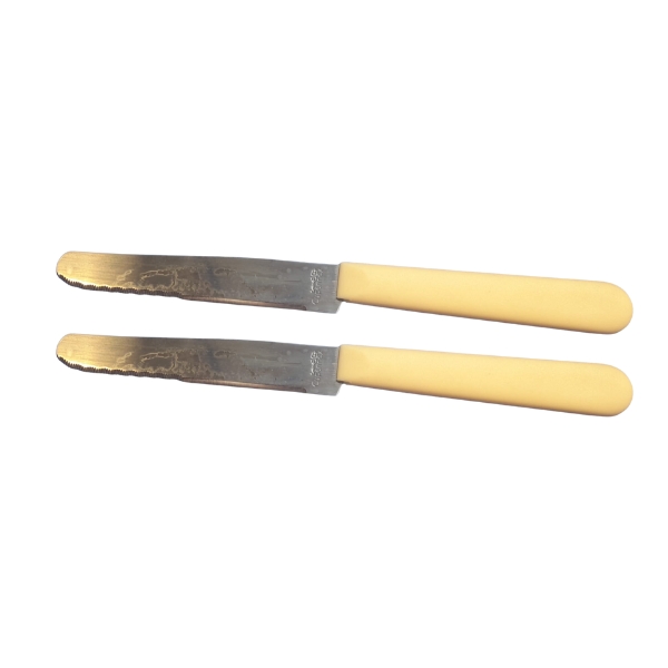 Pack de 2 Cuchillos de Mesa con media sierra y mango de plástico beige.