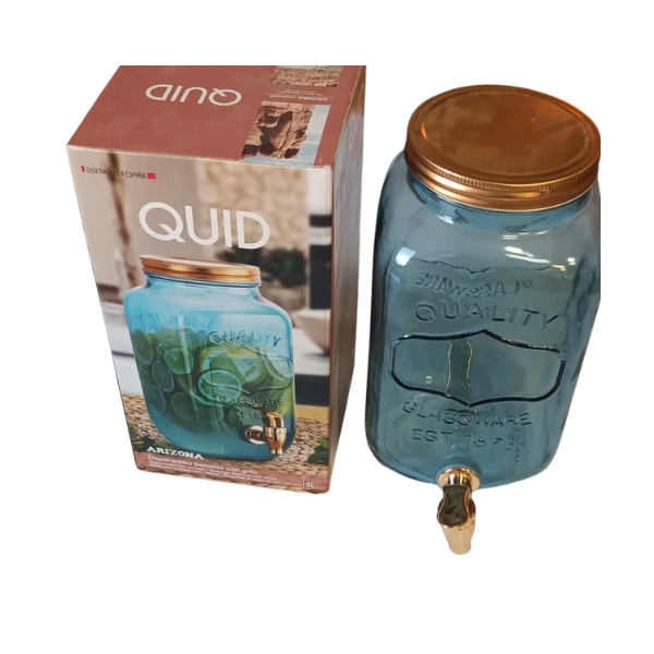 Dispensador bebida de cristal Modelo Arizona, en forma de tarro, con grifo y con tapa color cobre.
