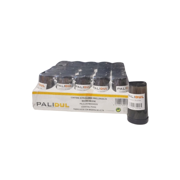 Bote palillero con dosificador para palillos redondos (cocktail picks) fabricados con madera selecta obteniendo la maxima higiene.