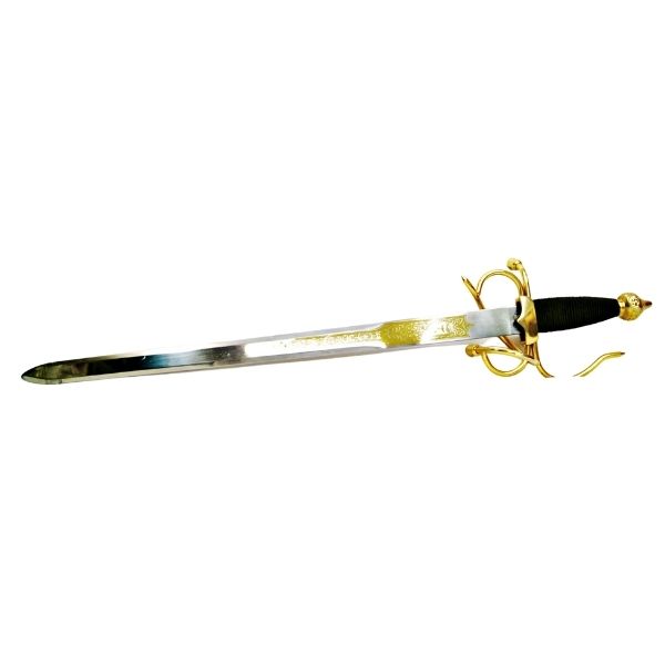 Cuenta con una hoja de acero inoxidable pulido, guarda y pomo dorados, y una empuñadura revestida en verde oscuro, aportando un estilo distinguido y clásico.