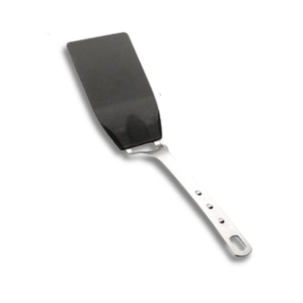 Espátula de cocina con mango de acero inoxidable y hoja de nylon.