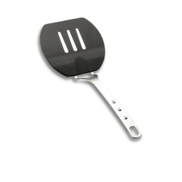 Espátula de cocina con mango de acero inoxidable y hoja de nylon.