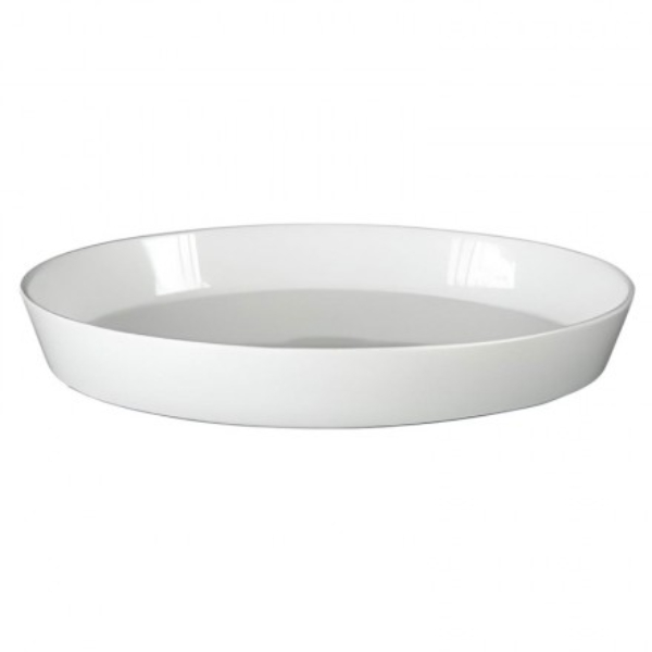 Fuente ovalada con paredes altas, de porcelana blanca de alta calidad.