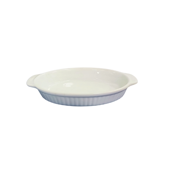 Fuente oval de porcelana de hosteleria blanca con asas.