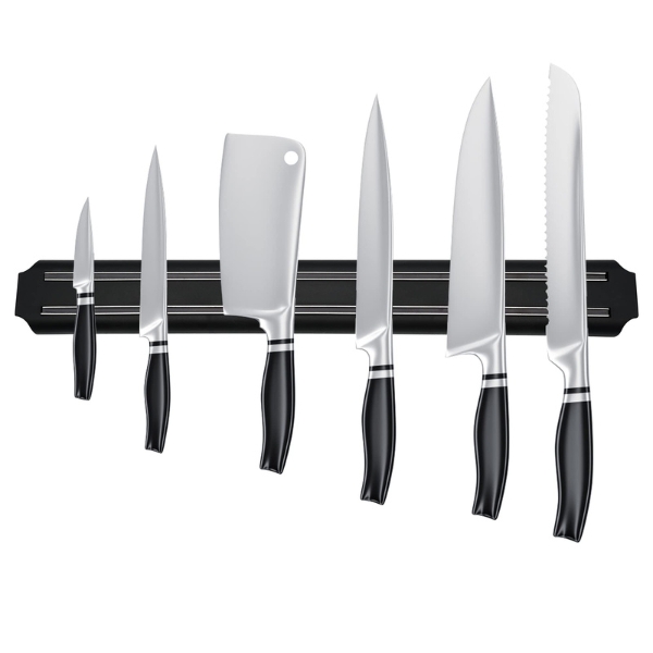 Soporte magnético para cuchillos y otros utensilios metálicos. Gracias a su imán es perfecto para disponer tus cuchillos y otros utensilios de cocina en la pared, de forma que tendrás mayor facilidad de acceso a ellos.
