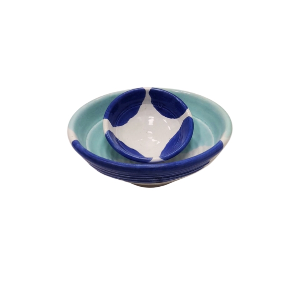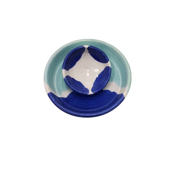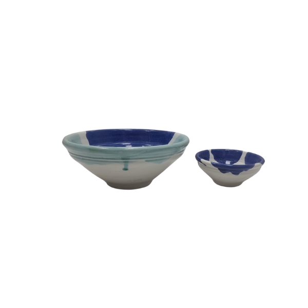 Juego de 2 lebrillos de barro hecho y decorado a mano en color azul, blanco y verde, ideal para exponer sus alimentos de manera tradicional.