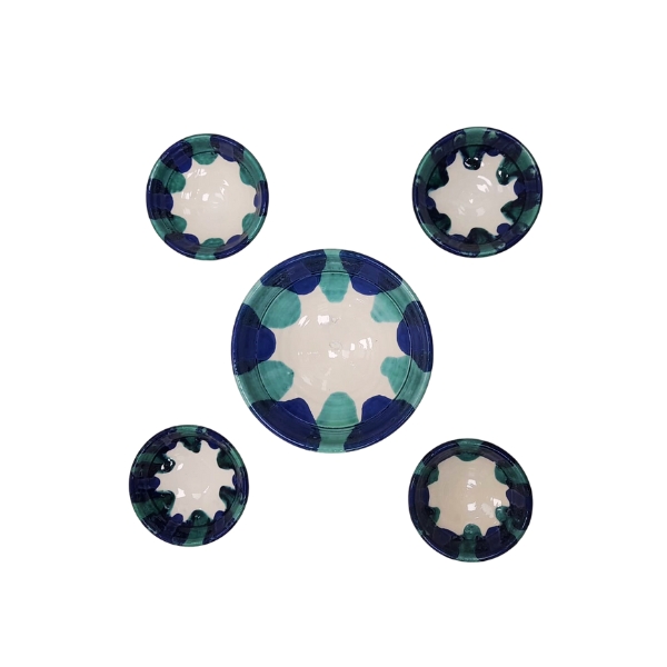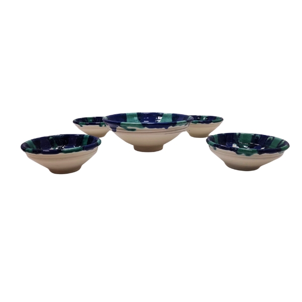 Juego de 4 + 1 ensaladeras lebrillos de barro hecho y decorado a mano en color azul, verde y blanco ideal para exponer sus alimentos de manera tradicional.