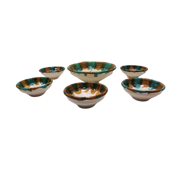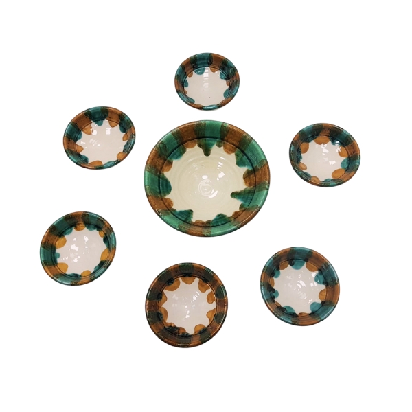 Juego de 6 + 1 ensaladeras lebrillos de barro hecho y decorado a mano en color verde, marrón y blanco, ideal para exponer sus alimentos de manera tradicional.