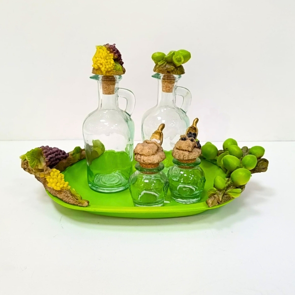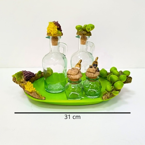 Juego de vinagrera de resina con bandeja decorada.