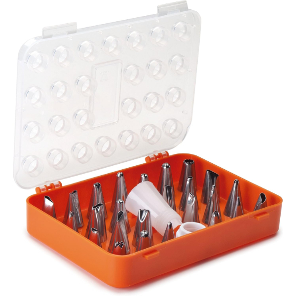 Juego de boquillas de acero inoxidable para decoración de tartas y pasteles compuesto por 26 piezas más adaptador.