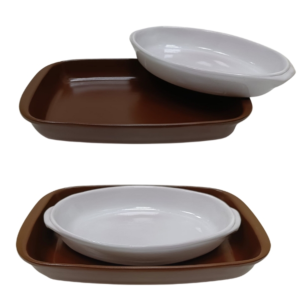 Lote de 2 fuentes, una rectangular en color chocolate y otra oval en color crema.
