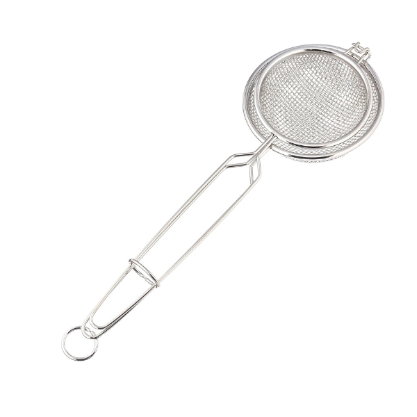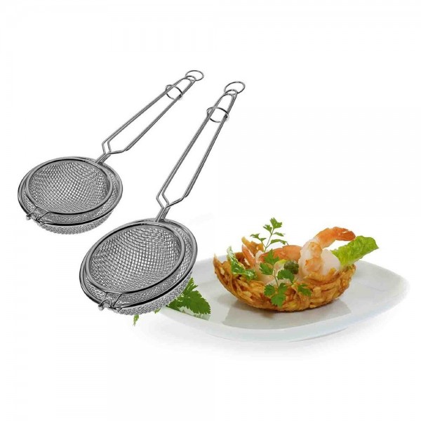 El mango es más largo que el de los coladores tradicionales, para evitar salpicaduras de aceite, y tiene sistema de sujeción para mantener cerrado el utensilio mientras se cocina.
