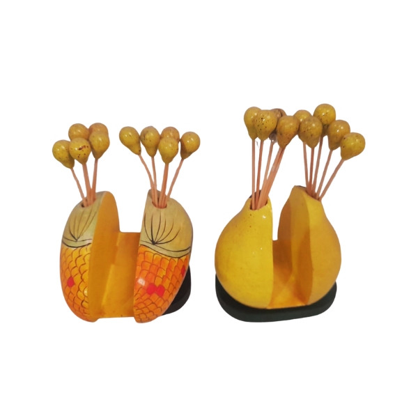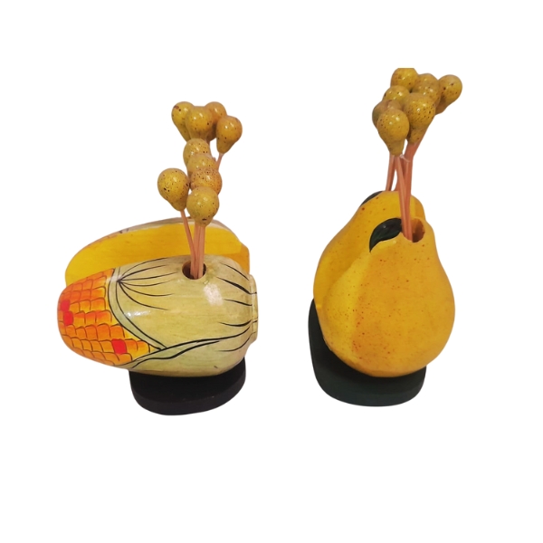 Palillero y Servilletero de madera con diseño de fruta y vegetal.