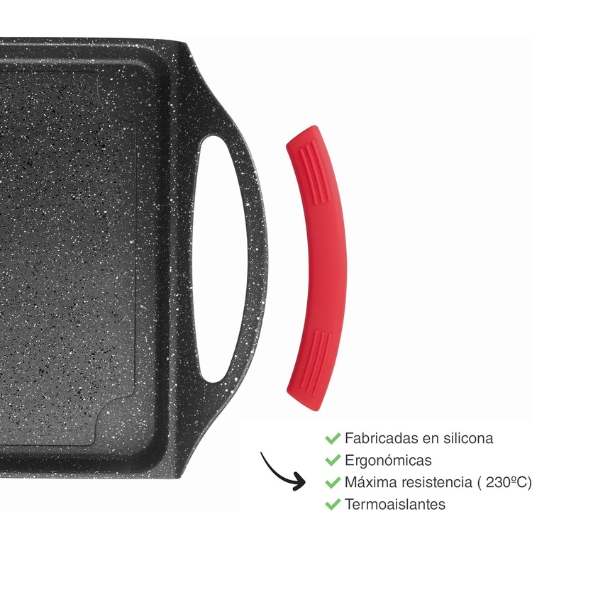 Fácil de manejar por las asas ergonómicas extraibles de silicona de alta resistencia (180ºC) y termo aislantes.