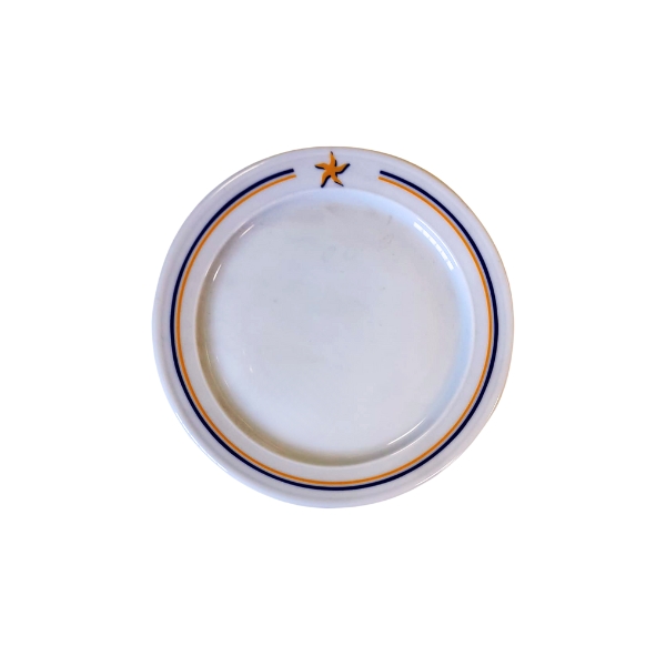 Añade un toque marinero a tu mesa con este plato de pan de porcelana de 15 cm, decorado con una elegante estrella de mar y un borde con líneas en azul y amarillo.