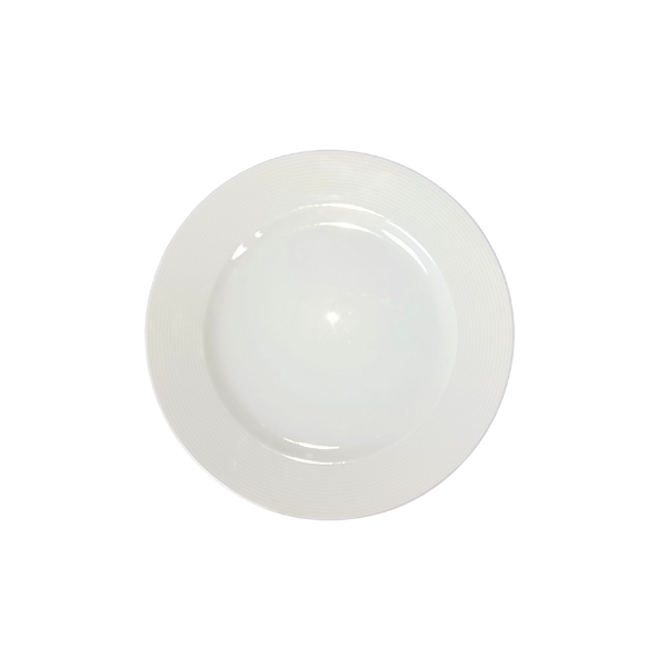 Plato hondo de porcelana blanca modelo REY con líneas en relieve en los bordes.