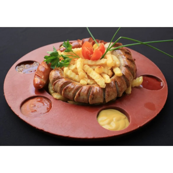 Diámetro 30 cm, con un grosor de 2 cm, con hueco de 6 salsas o quesos.