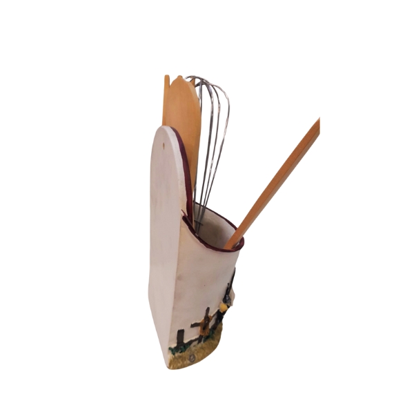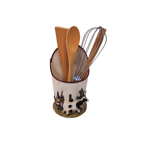Este encantador porta-utensilios está elaborado en cerámica y resina, y presenta un decorado en relieve de una simpática vaca, ideal para quienes aman los detalles únicos en su hogar.