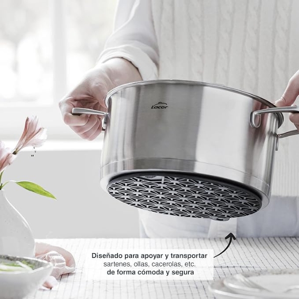 Diseñado para apoyar y transportar sartenes, ollas, cacerolas, etc. de forma cómoda y segura, sin riesgo a quemarse.