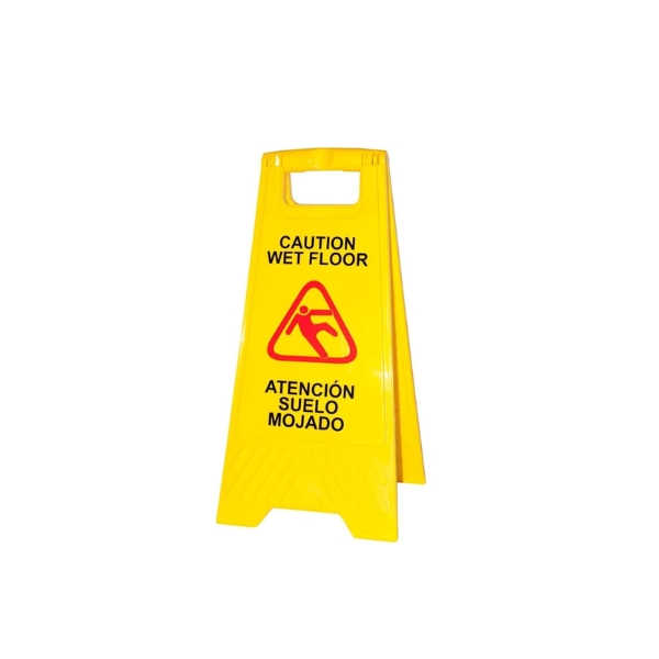 Señal plegable de suelo color amarillo bilingüe ambas caras con mensaje » ATENCIÓN SUELO MOJADO – CAUTION WET FLOOR» ideal para poner en el suelo cuando esté mojado y así evitar posibles resbalones y/o caídas.