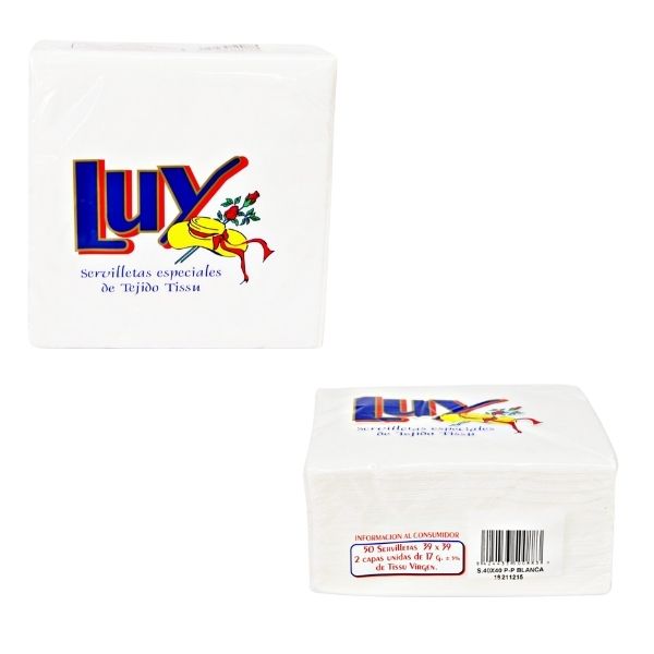Presentada en caja de 1.200 unidades organizadas en 24 paquetes de 50 servilletas de color.