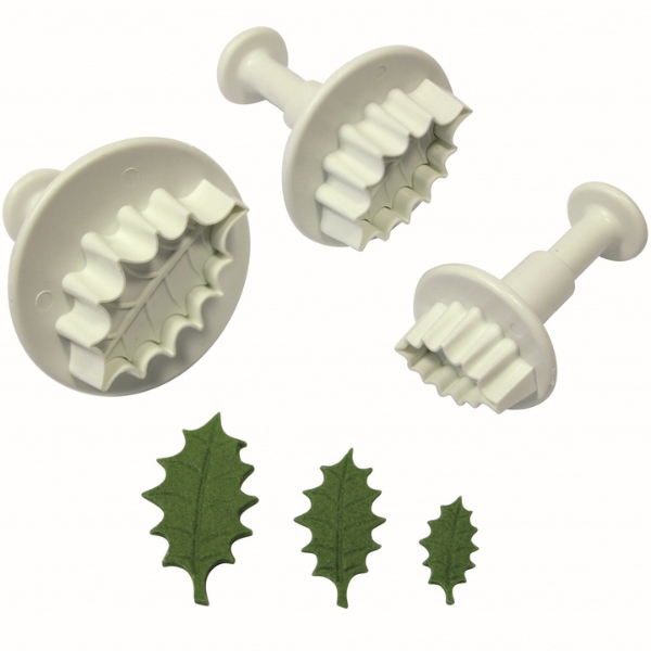 Juego de 3 cortadores de fondant con expulsor con la forma de hoja de acebo con detalle de sus nervios y acabados.