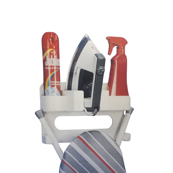Soporte multiple fabricado en plastico color blanco, ideal para guardar la tabla de planchar, plancha y sus complementos aprovechando al máximo el espacio.