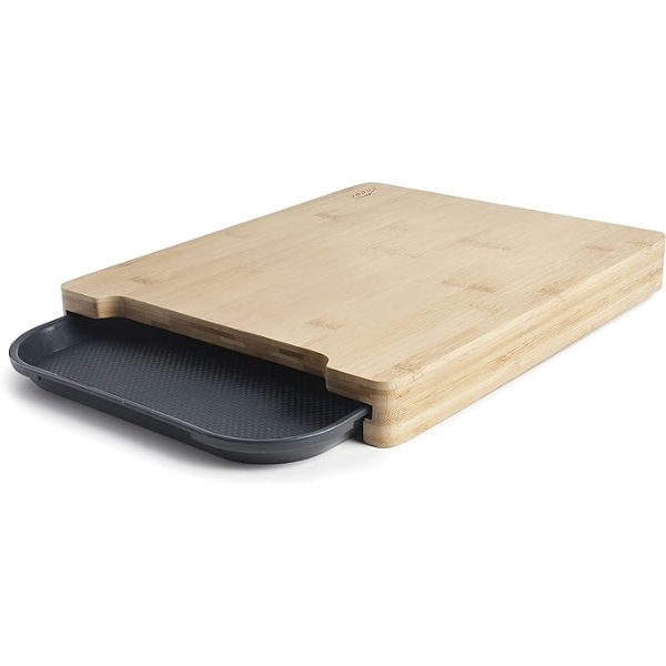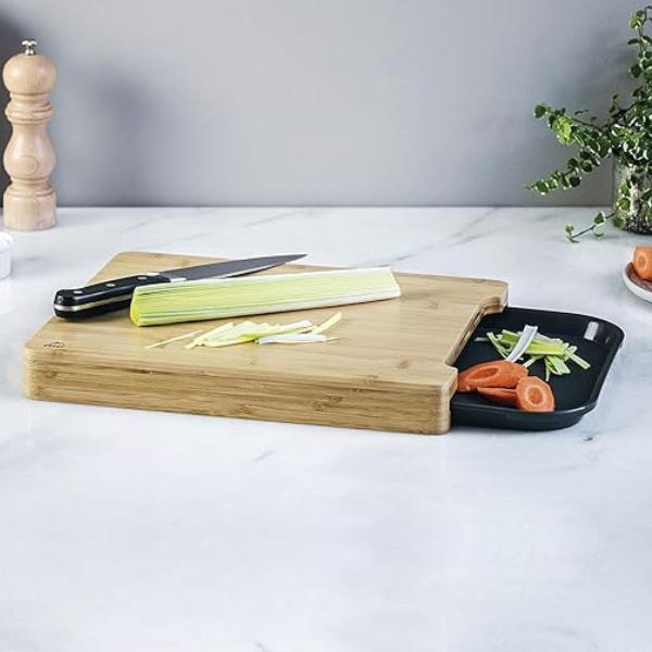 Práctica tabla de corte fabricada en bambú con una cubeta de PP oculta completamente extraible.