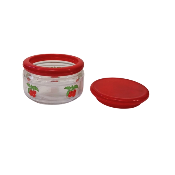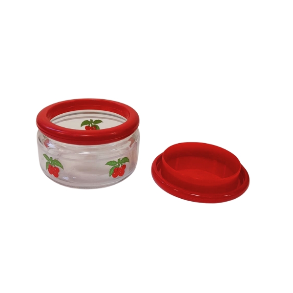 Tarro en vidrio transparente con tapa de plástico con decoración cerezas.