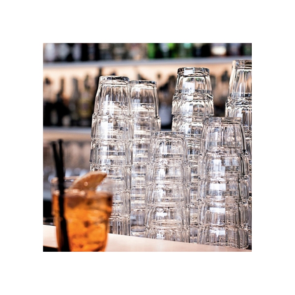 Vaso bajo apilable en transparente de la serie Rock Bar fabricado en cristal templado o tensionado, con gran resistencia a los choches mecánicos que puede sufrir entre el choque de dos vasos.