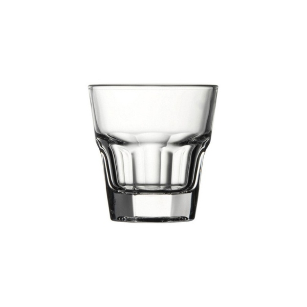 Vaso de licor en vidrio transparente prensado.