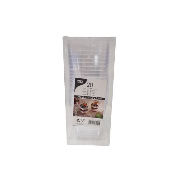 El Vaso de Catering Angular transparente está fabricado en plástico de poliestireno (PS), ideal para postres o aperitivos.